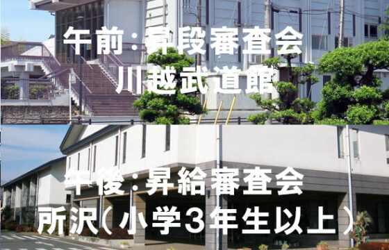 (午前)昇段審査会 川越武道館 〒350-0053 埼玉県川越市郭町2丁目 川越市立博物館 TEL 049-224-7220 (午後)昇級審査会 狭山市立武道館 〒350-1305 埼玉県狭山市...